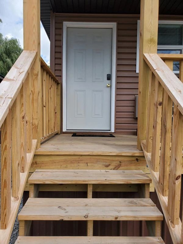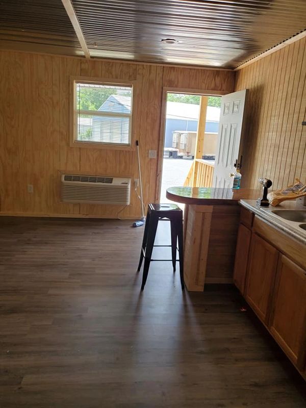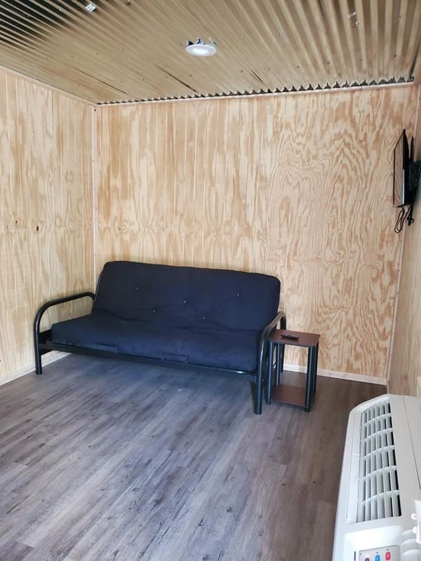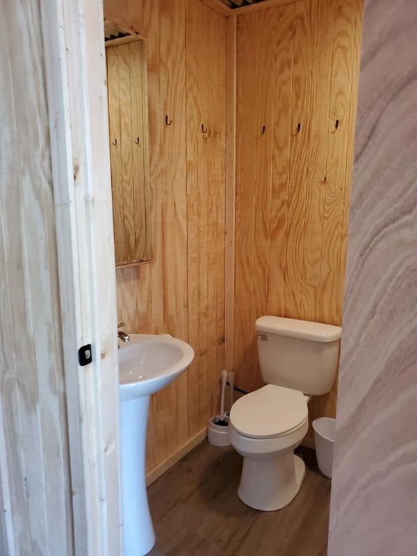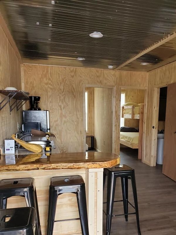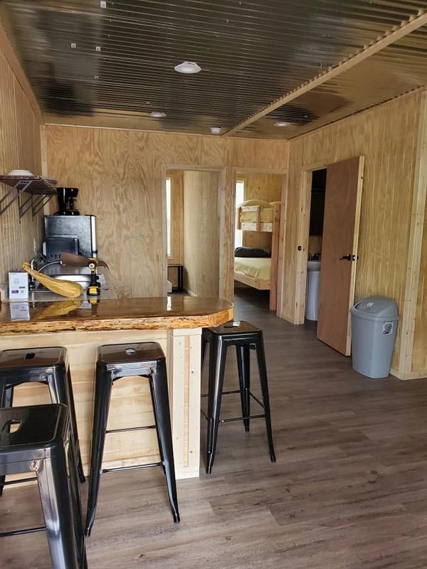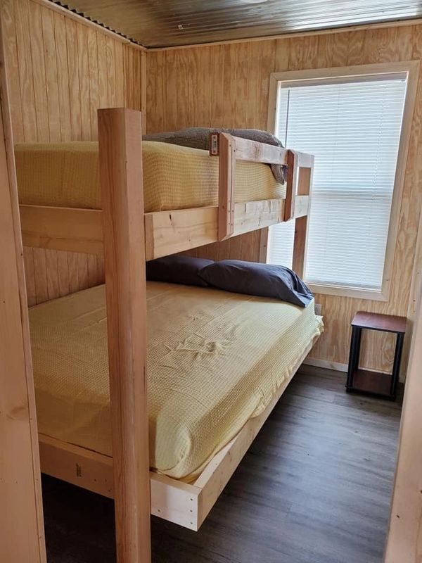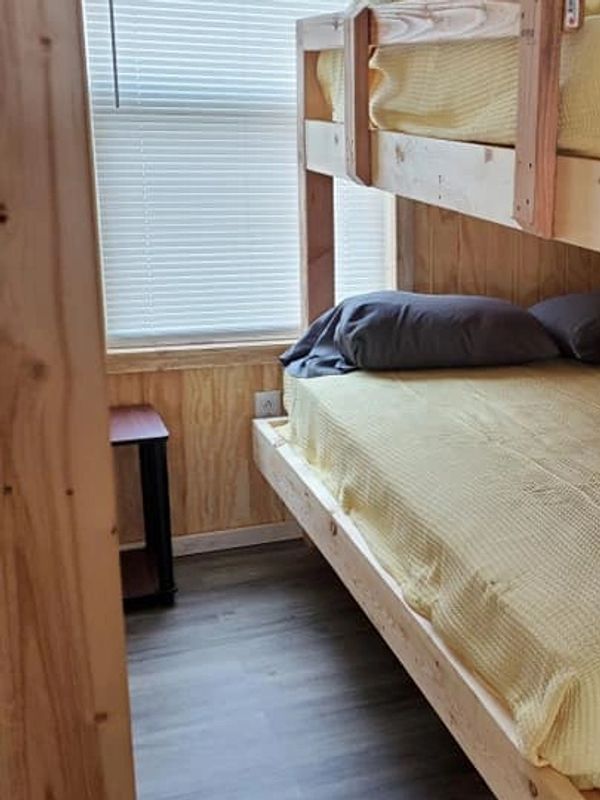 Each cabin has two bedrooms with a full bed on the top bunk and a queen on the bottom bunk. One bathroom with a standing shower. Kitchenette which includes a hotplate, microwave, fridge, and toaster. Living room with TV. Linens are provided. Wifi is also provided.